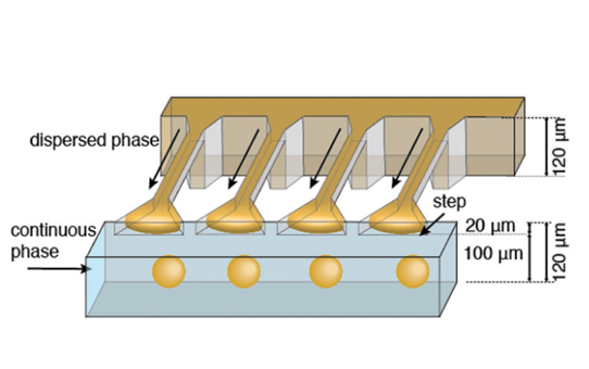 阶梯乳化是一种微流体技术,用于生产单分散液滴,这些液滴在大小和形状上都是均匀的。这种方法在药物递送、诊断和材料科学等领域中特别有用,因为这些领域需要精确控制液滴大小。
