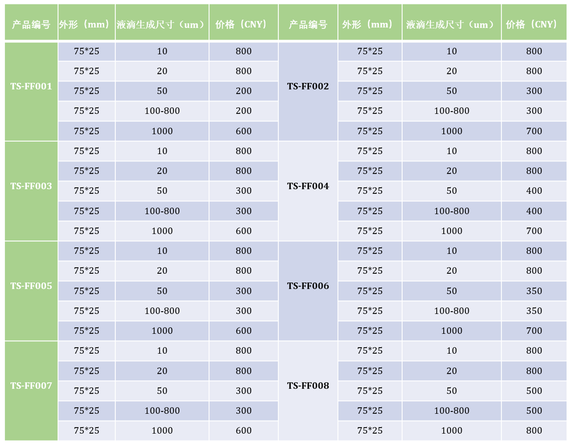 - 通道和孔口尺寸:通道的宽度和深度以及孔口的大小显著影响液滴的大小和形成频率。