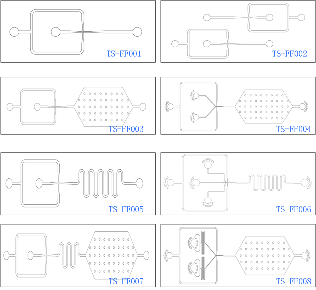 设计:流动聚焦结构通常由一个用于分散相的中央通道和两个用于连续相的侧通道组成。这些通道在一个狭窄的孔口处汇合,液滴的形成就发生在这里。